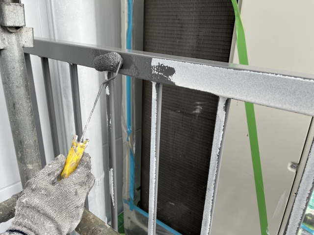 清掃後、錆止め塗料を均一に塗布します。塗り残しがあると再発の原因となるため、細部まで丁寧に施工する必要があります。錆止め塗料は中塗りの密着性を高めるプライマーの役割も兼ねています。