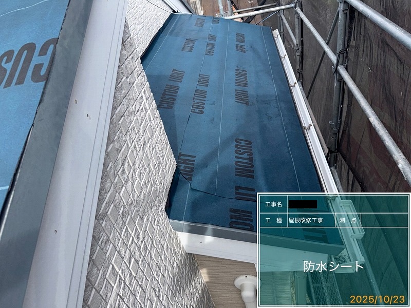 ・屋根作業工程は既存屋根役物撤去(棟押さえトタン、抜き板、雪止め)→既存屋根に防水シート→ケラバや唐草に専用役物取付→屋根本体取付→棟押さえ取付→完成!