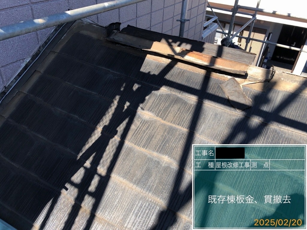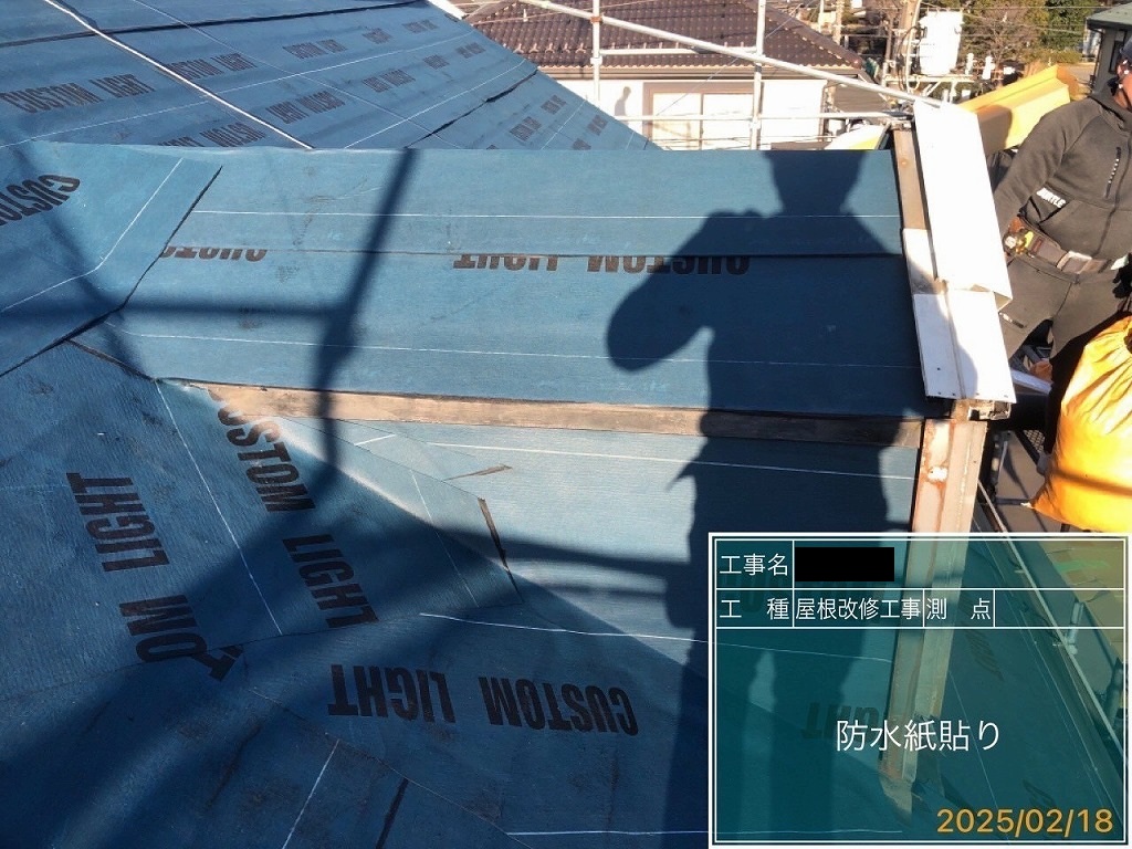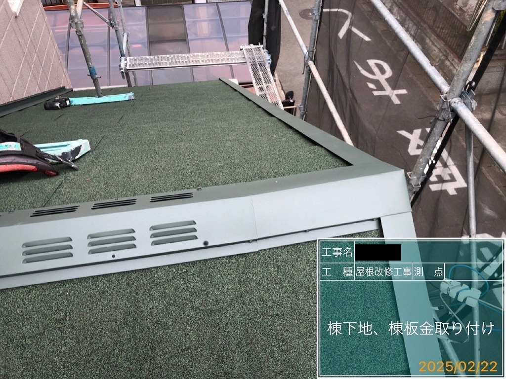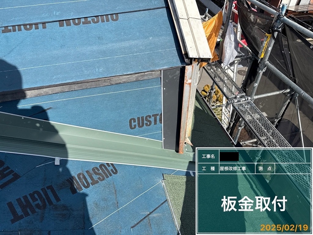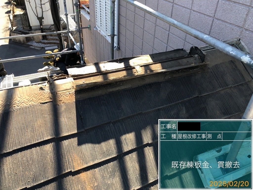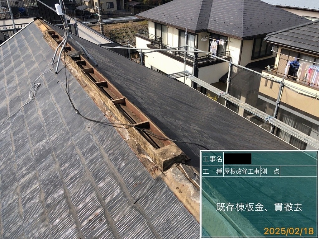 ・屋根作業工程は既存屋根役物撤去(棟押さえトタン、抜き板、雪止め)→既存屋根に防水シート→ケラバや唐草に専用役物取付→屋根本体取付→棟押さえ取付→完成!
