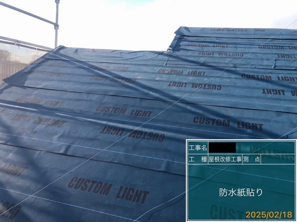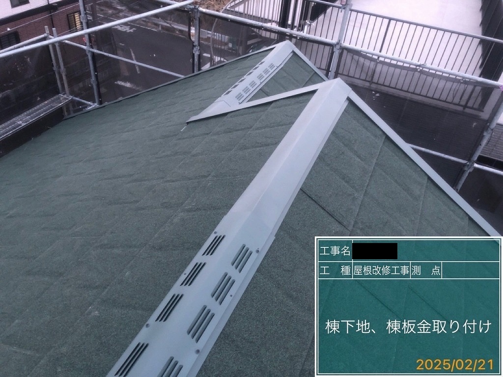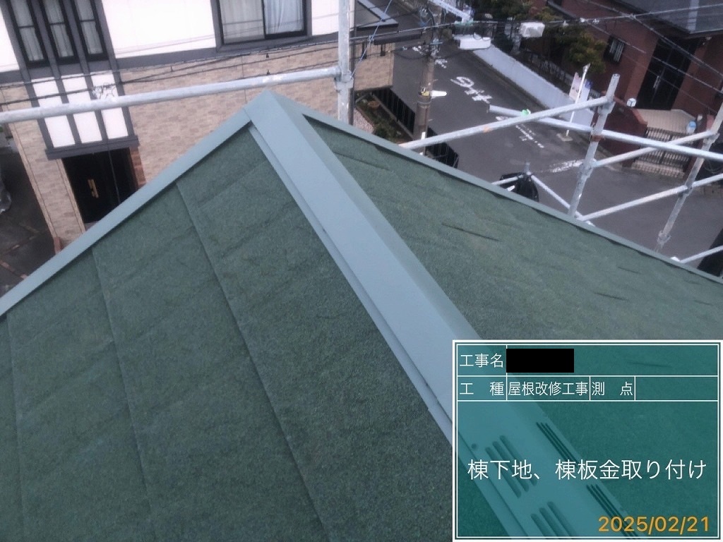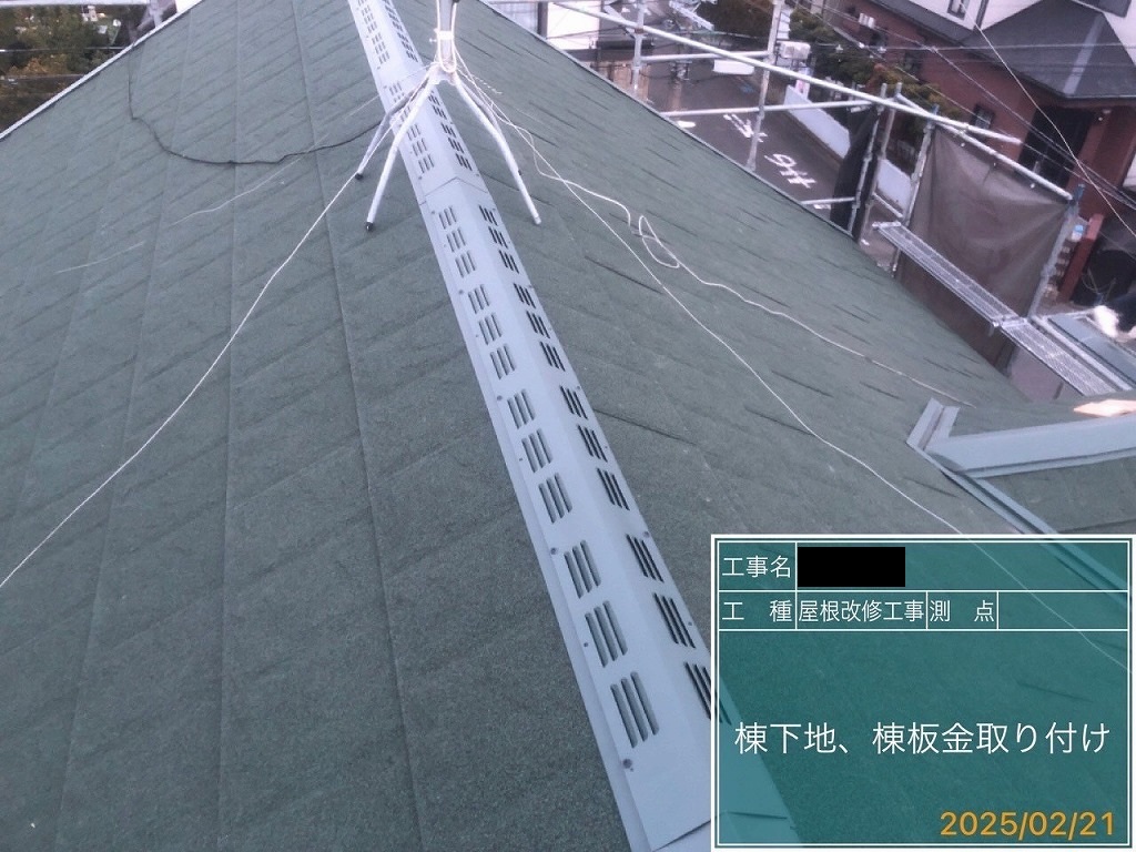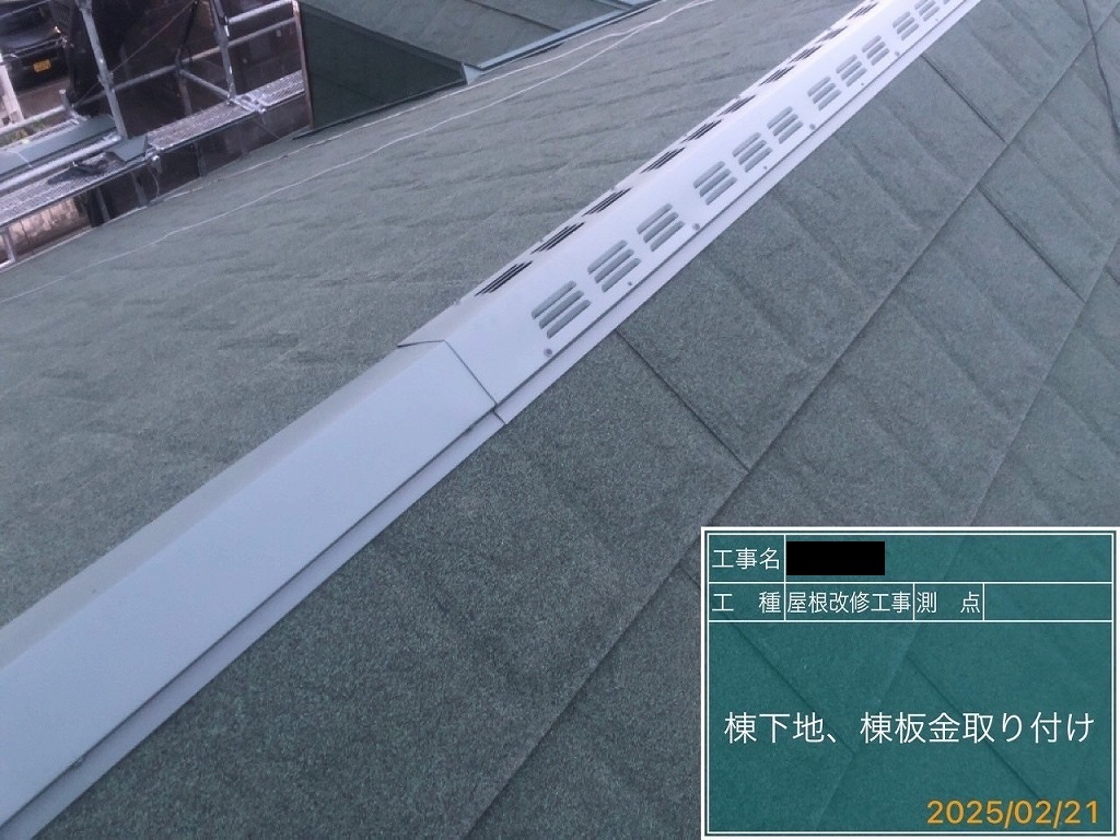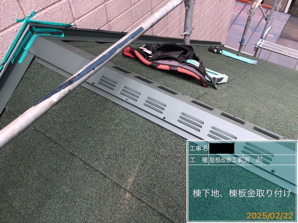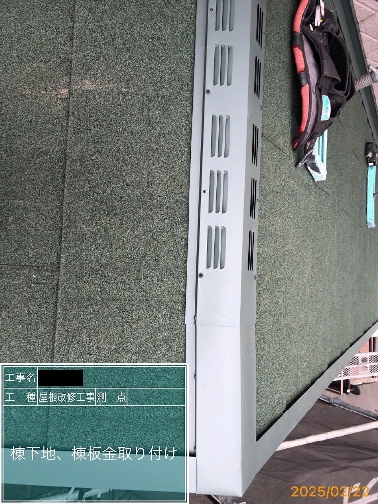 ・屋根作業工程は既存屋根役物撤去(棟押さえトタン、抜き板、雪止め)→既存屋根に防水シート→ケラバや唐草に専用役物取付→屋根本体取付→棟押さえ取付→完成!