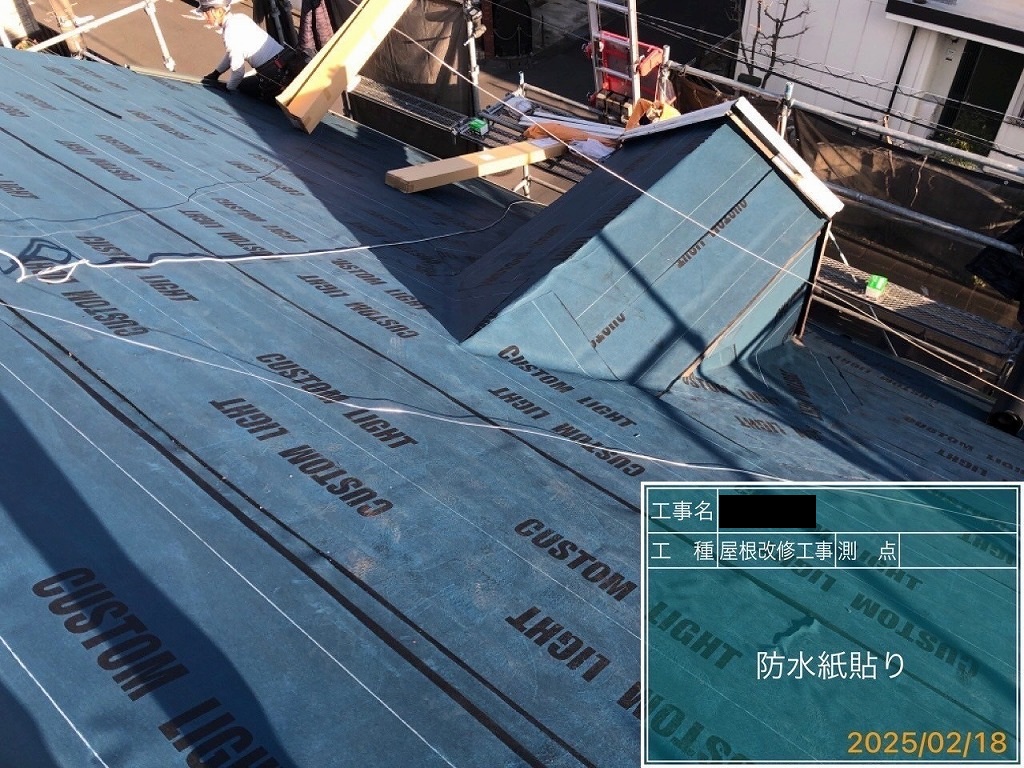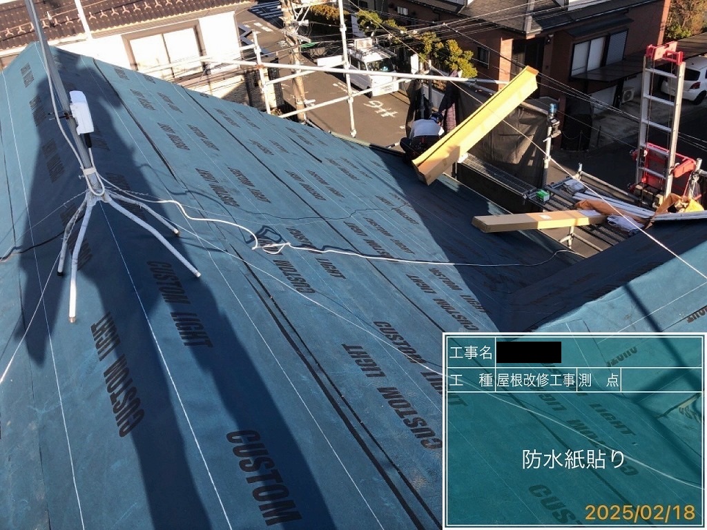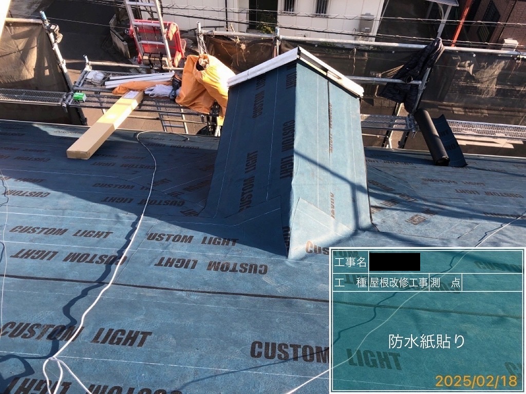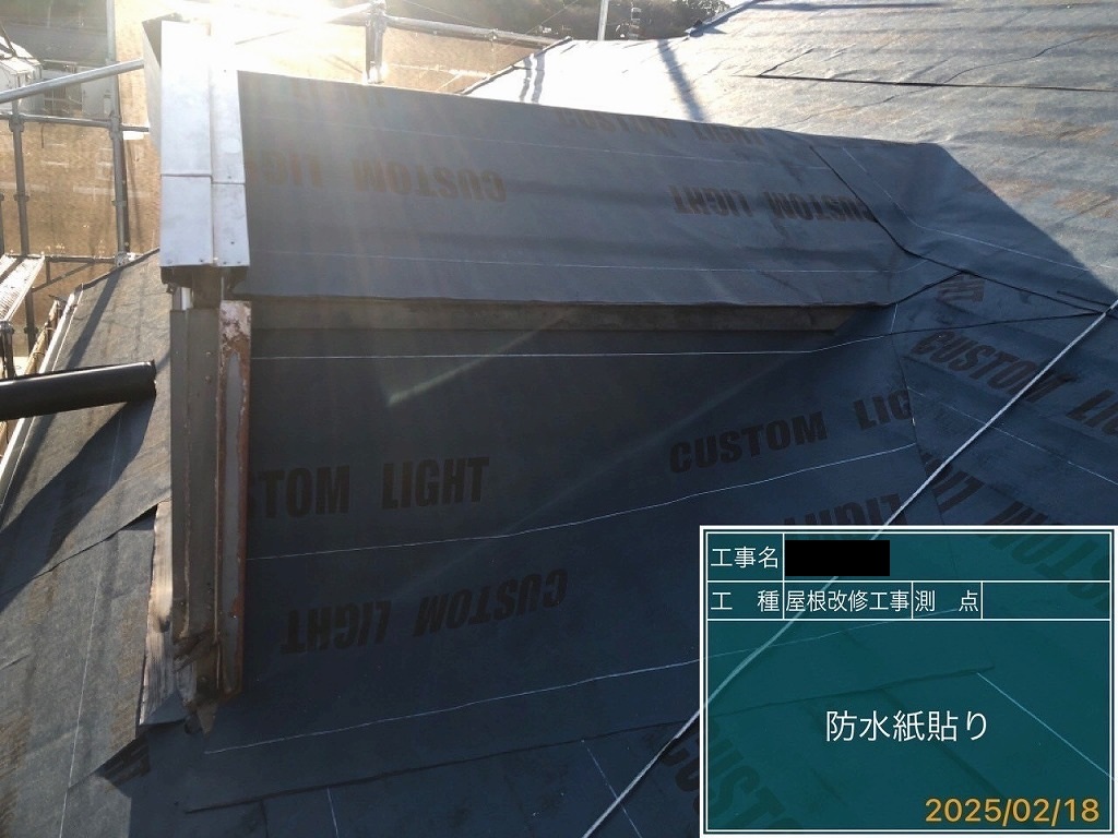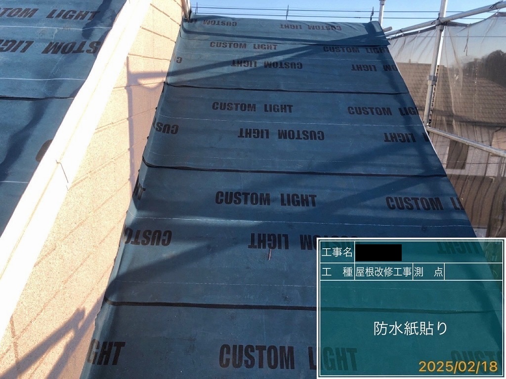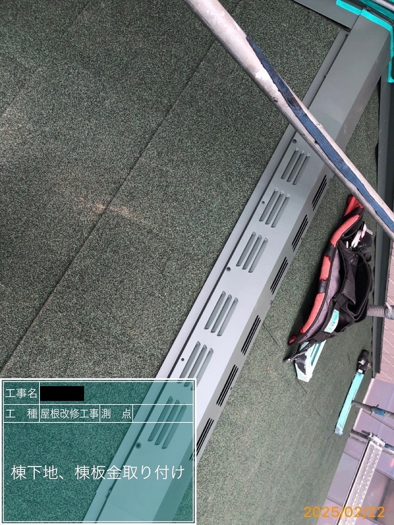 ・屋根作業工程は既存屋根役物撤去(棟押さえトタン、抜き板、雪止め)→既存屋根に防水シート→ケラバや唐草に専用役物取付→屋根本体取付→棟押さえ取付→完成!
