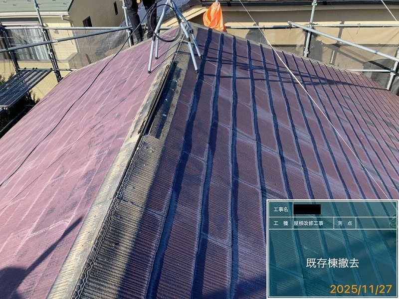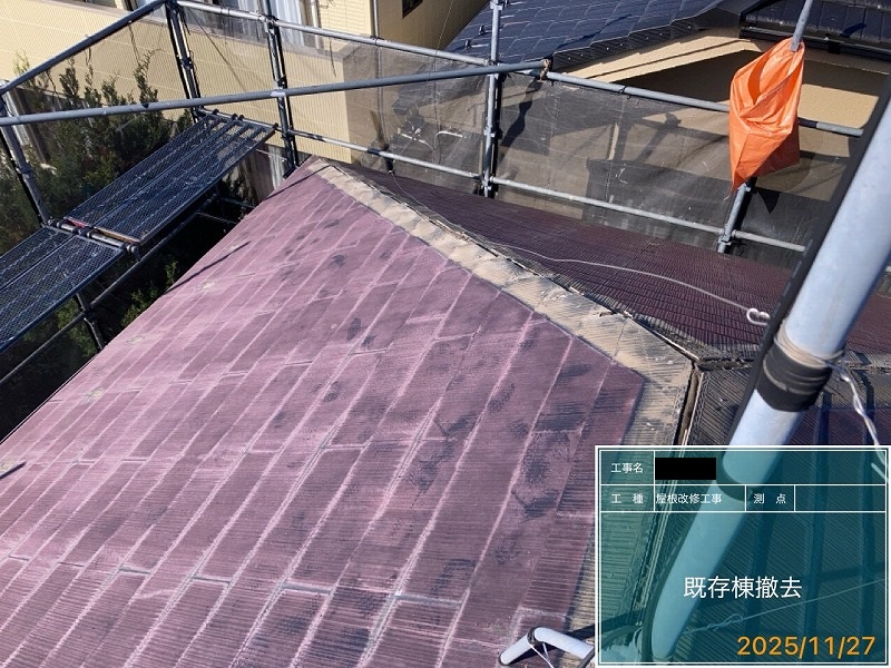 ・屋根作業工程は既存屋根役物撤去(棟押さえトタン、抜き板、雪止め)→既存屋根に防水シート→ケラバや唐草に専用役物取付→屋根本体取付→棟押さえ同質役物取付→完成!