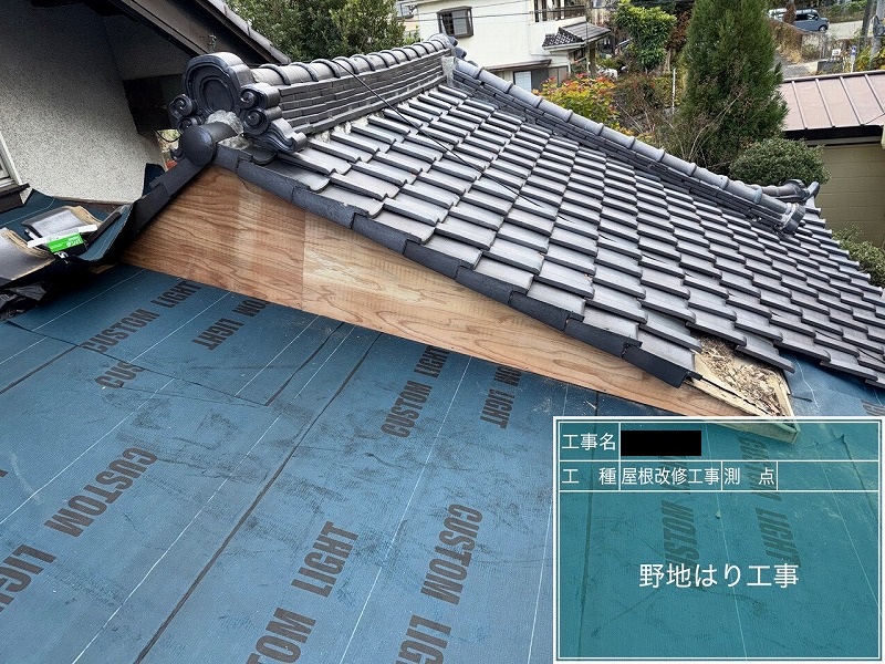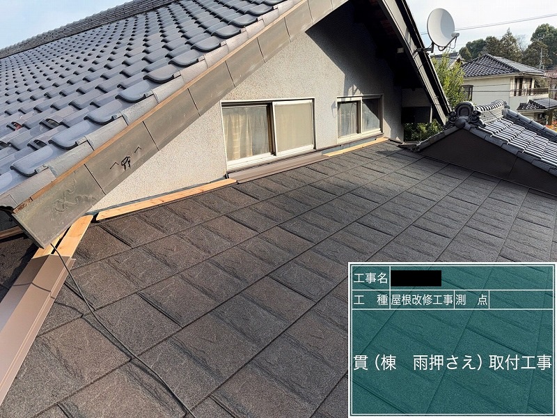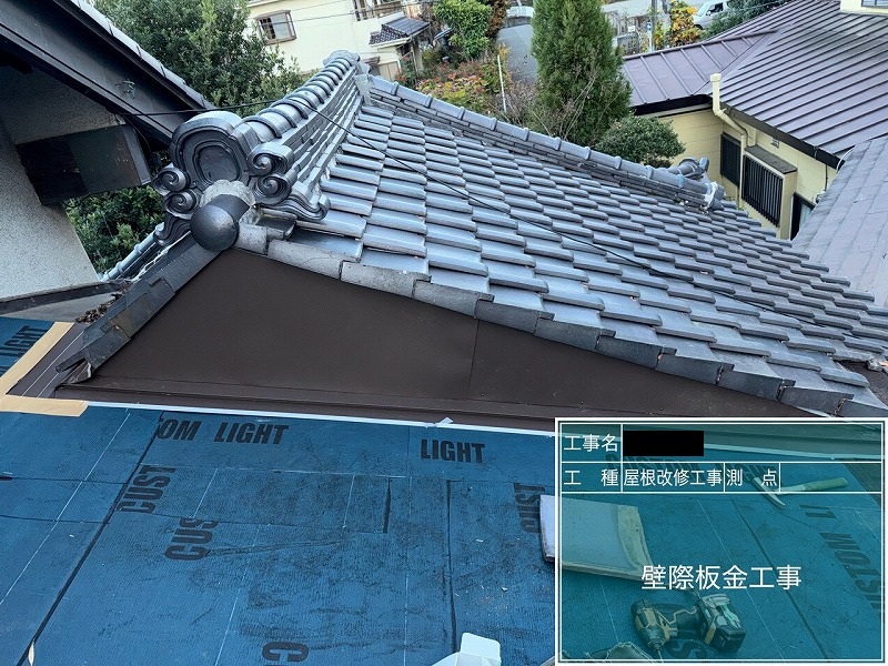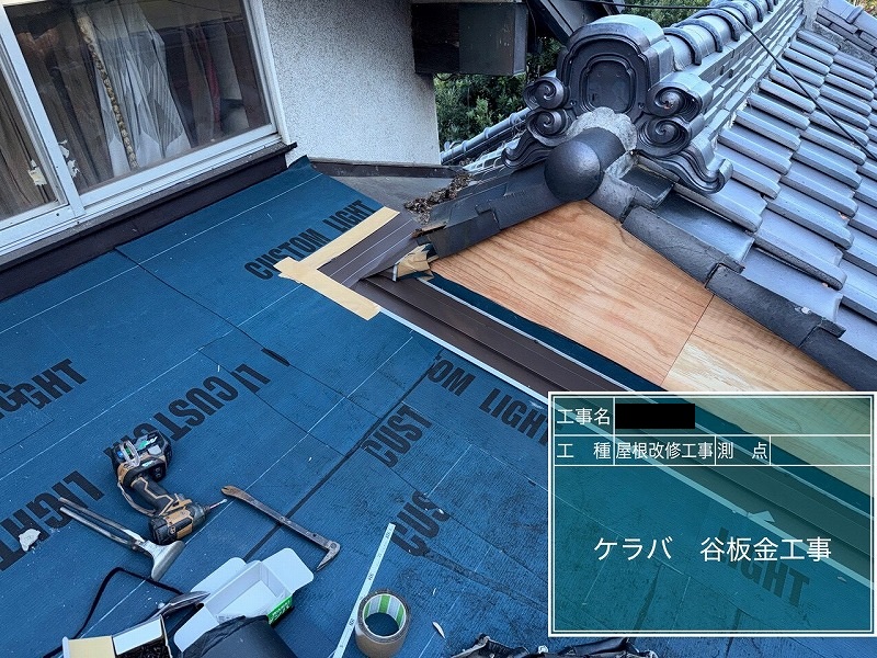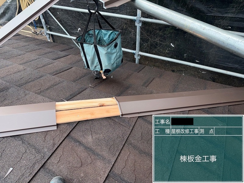 ・屋根作業工程は既存屋根役物撤去(棟押さえトタン、抜き板、雪止め)→既存屋根に防水シート→ケラバや唐草に専用役物取付→屋根本体取付→棟押さえ取付→完成!